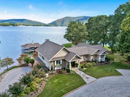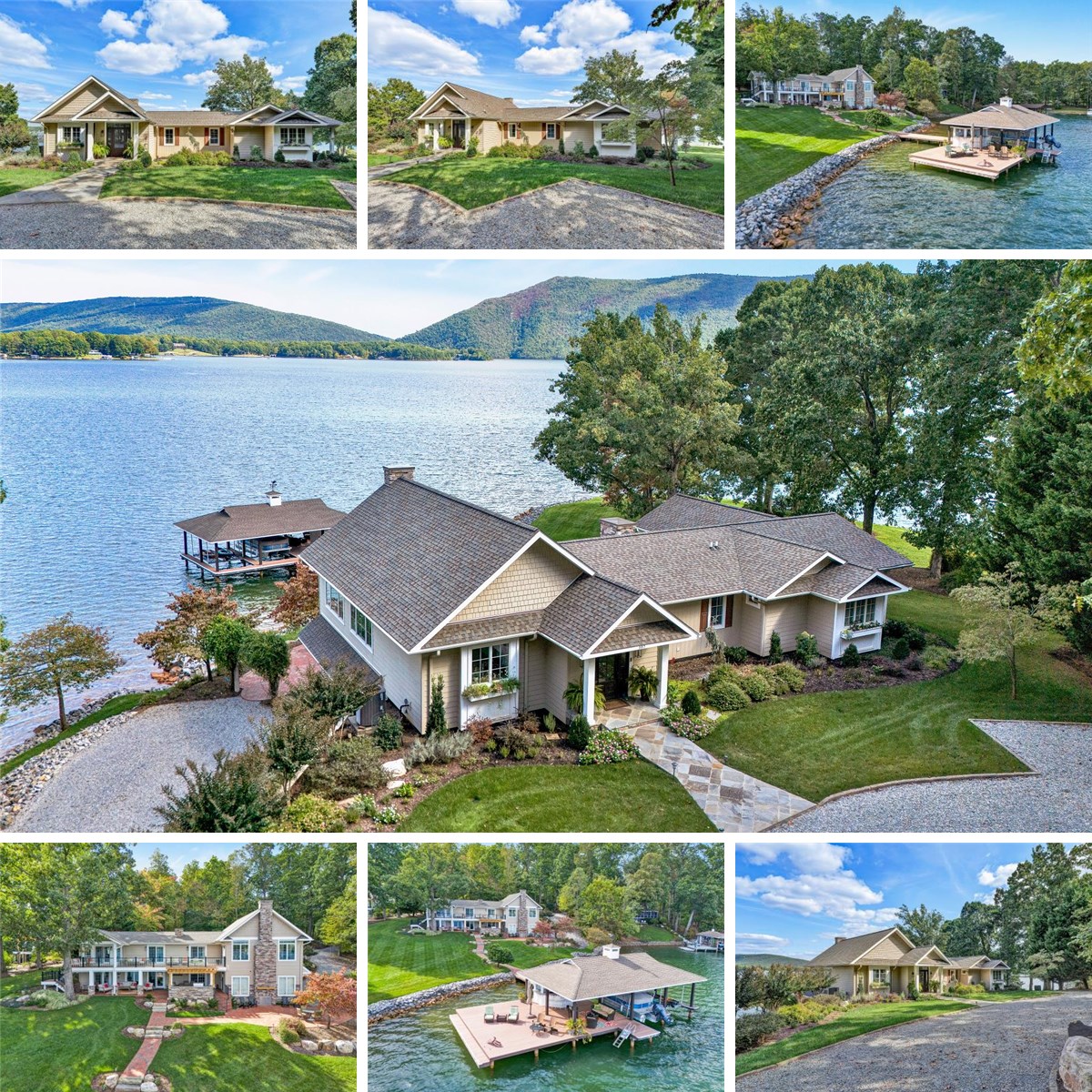 Dreams Come True at Smith Mountain Lake! Experience breathtaking mountain vistas and stunning sunset views from this nearly level point lot. Perfect for entertaining, this home offers abundant space for family and friends to create unforgettable memories. As you approach, you'll feel like you've entered a private park—surrounded by mature trees and a winding driveway that leads to a charming circular drive. A beautifully landscaped stone walkway welcomes you into the home. Inside, the entry foyer opens to a fabulous great room with vaulted ceilings, a stone fireplace, and large windows that frame the ''million-dollar view.'' The gourmet kitchen features a center island overlooking the open dining and living areas, perfect for gatherings. Enjoy the seamless flow to the composite open and covered decks, where panoramic mountain views are spectacular. The main level also includes a Den / Office with Stone Fireplace. There is a spacious primary suite with private deck access, a luxurious bathroom with a tile shower and double granite sinks, a second waterfront bedroom, and a second bathroom. Convenient washer and dryer hookups are located in the hall closet. The lower level offers a recreation room with a wet bar, ideal for entertaining, and walks out onto a spacious patio. This level also features two additional bedrooms and a well-appointed bathroom, along with a second laundry area. Generous oversized lower level garage with entry driveway. Step outside to enjoy the wood-plank ceilings, paver flooring, and an outdoor kitchen complete with a BBQ grillmaking outdoor cooking a delight against the stunning backdrop. The paver patio extends to an outdoor fireplace and a potential firepit area, perfect for cozy evenings. Leading down to the oversized boat dock, you'll find composite decking, two covered boat slips, and ample space for lounging and entertaining. The dock also includes storage, a bar area with roll-up windows, and open decking for sunbathing. The beautifully landscaped lot boasts a sprinkler system, adding to its curb appeal and waterfront charm. And the best part? Short-term rentals are allowed (though no current history due to owner use). This is truly an extraordinary property that combines luxury, functionality, and natural beauty.