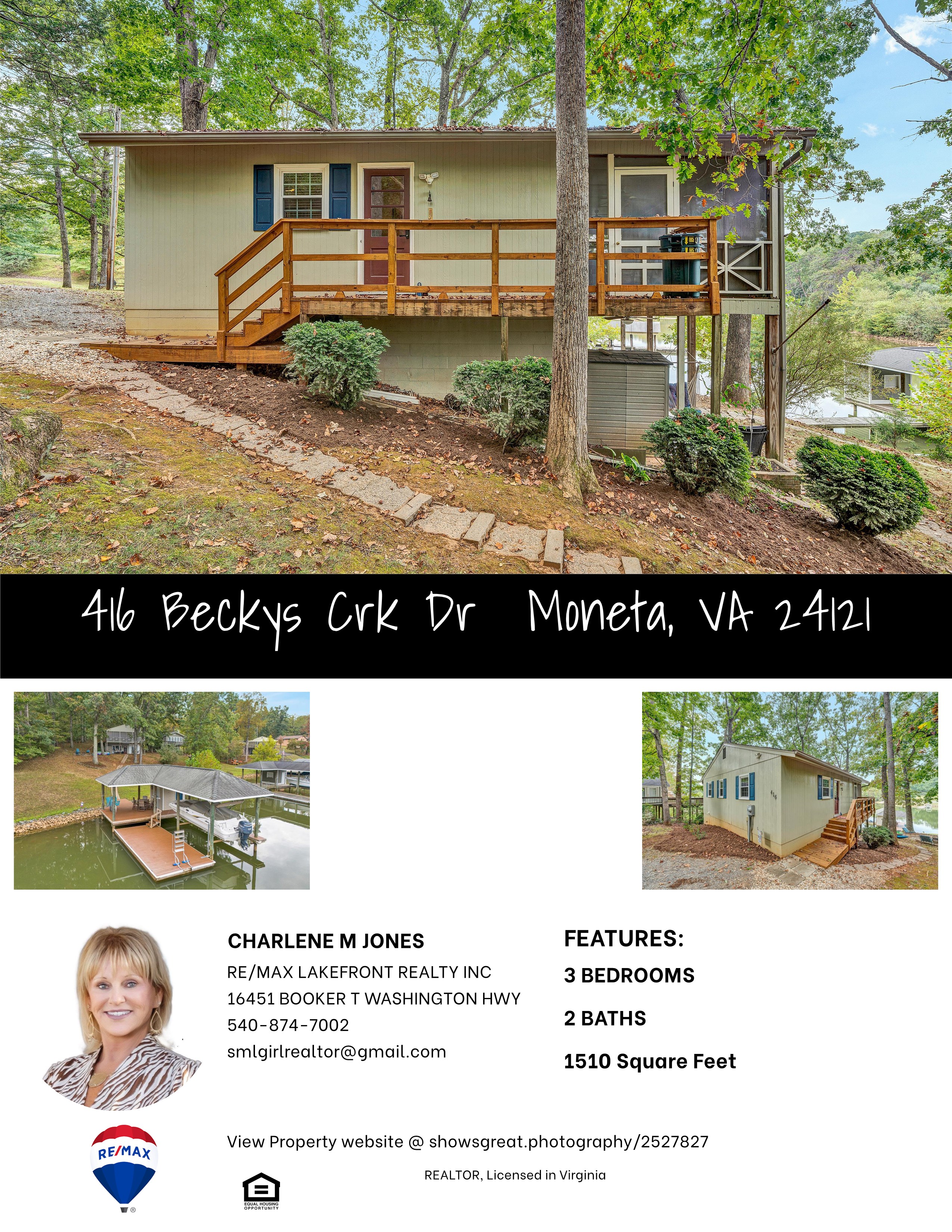 Adorable waterfront furnished cottage is perfectly situated on a gentle slope at beautiful Smith Mountain Lake off Scruggs Road. The entry level features 2 bedrooms, kitchen with an island, dining area, living room with fireplace, and a spacious screen porch overlooking the lake. The lower level includes the family room, full bathroom, laundry room, 3rd bedroom, and covered patio. Very gentle slope to the boat dock with trex decking, Tiki bar, storage building, 1 boat lift, and 2 jet ski ports. Boat and Jet Ski negotiable. Deep water for all water activities. Perfect location by land and water. Minutes to area amenities, Roanoke, and Lynchburg.