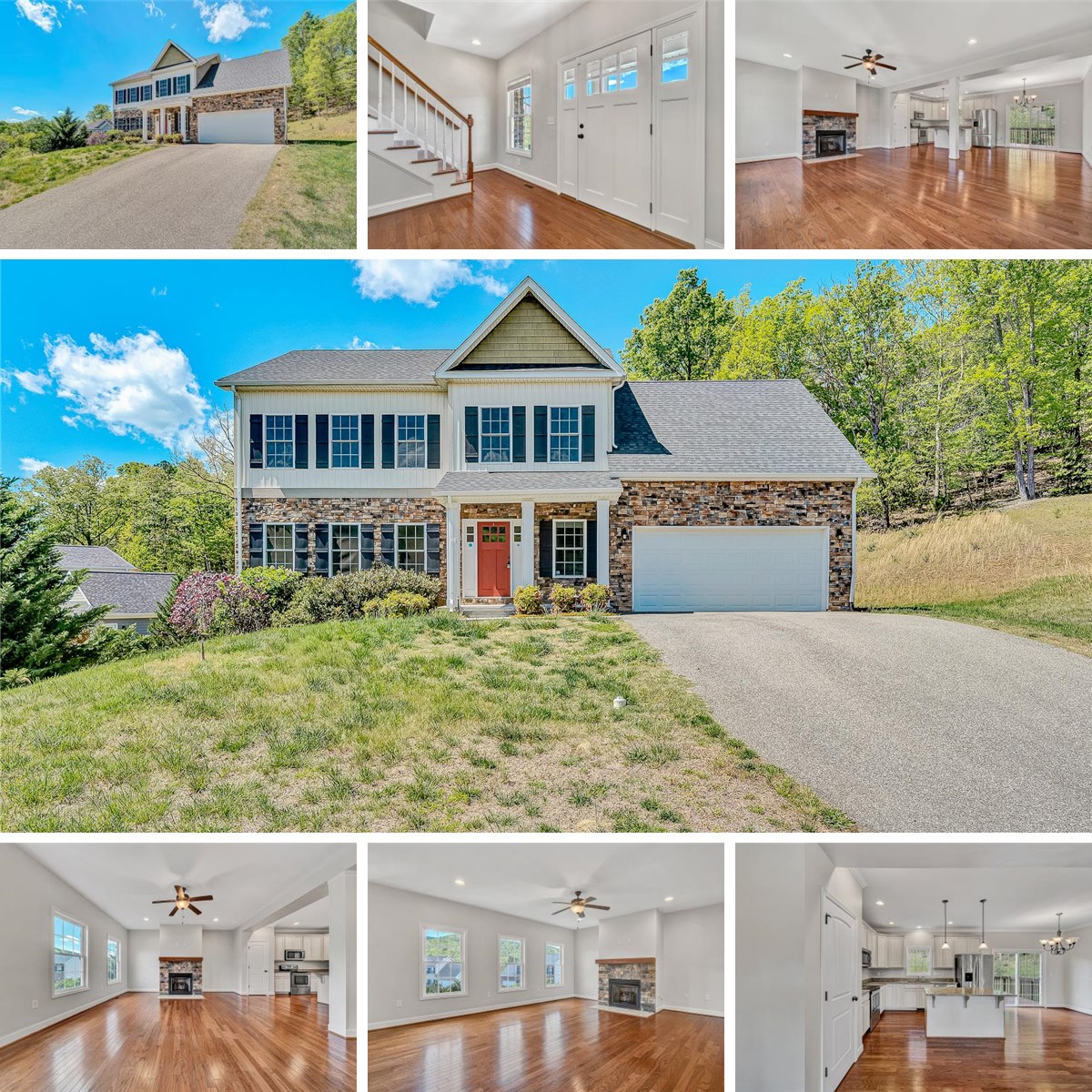 Berkeley Farms Winston model with numerous upgrades! Features 9' ceilings on the main level, covered front porch with stone columns, and open-concept layout with gas log fireplace. L-shaped kitchen overlooks dining area, plus first-floor office. Oversized 600 sq ft garage offers excellent storage or workspace. Upstairs includes laundry, guest bath with dual vanity, and spacious primary suite with tray ceiling, large walk-in closet, and private bath with water closet.