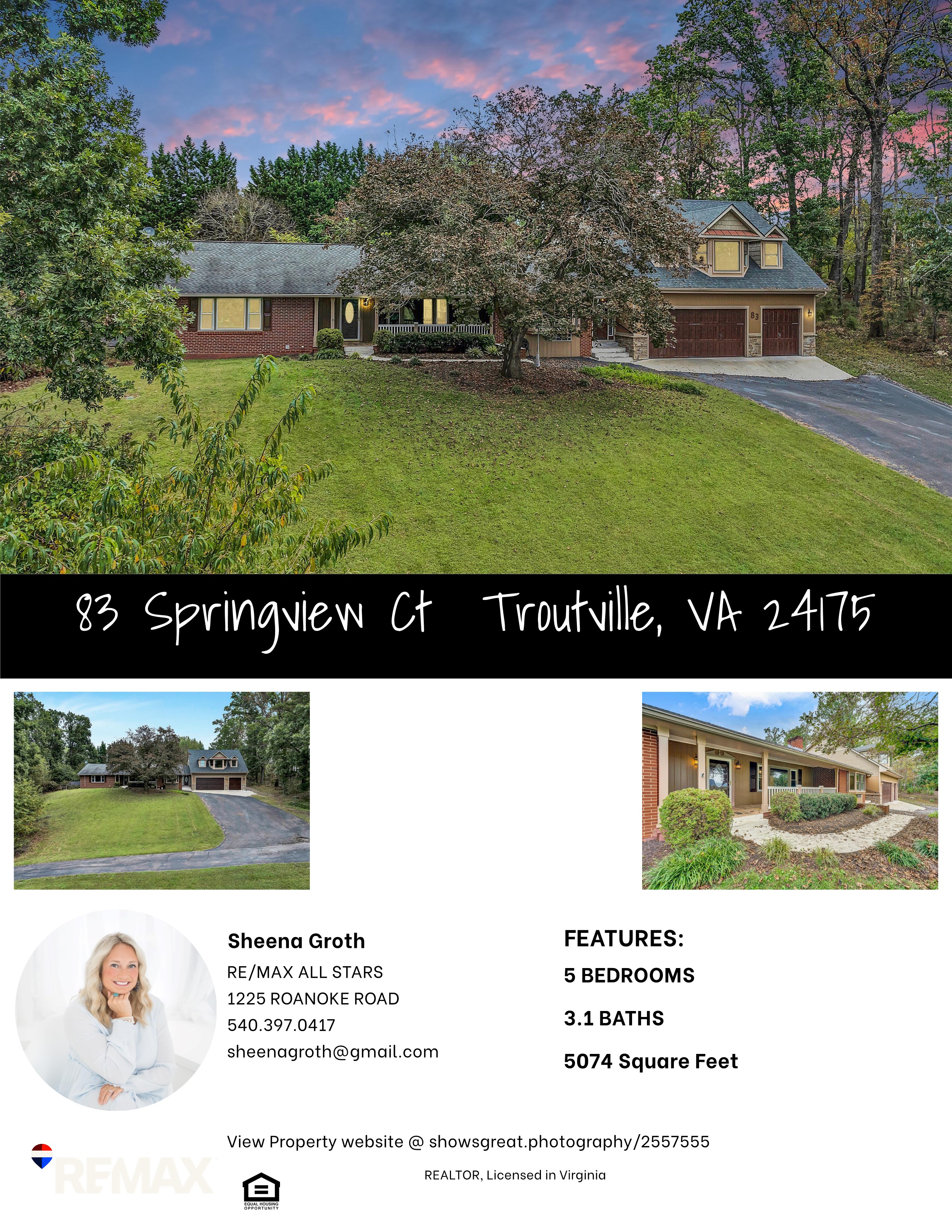 If you're looking for beautiful mountain views in Botetourt county, Then look no further! This 5 bedroom, 3.1 bath home has it all. With over 5k sq. Feet, A key feature of this home is the large open bonus room above the garage. With stunning views out the bay window, a half bath, a balcony overlooking the amazing backyard space, and plumbing already in place for a wet bar, this is a great multipurpose space. With in-law quarters on the lower level, This home can be multi-generaltional or can provide for additional income possibilites. With a spacious kitchen offering an instant hot water dispenser, multiple dining areas, A large Breezeway/foyer, a stunning master bathroom, and french doors leading to a beautiful sunroom this home has features that go on and on! The backyard space features a fenced in hot tub and in-ground saltwater pool surrounded by a new trench drain. In addition to the 3 car attached garage, a large detached garage with electrical is also located on the 2 acre property.